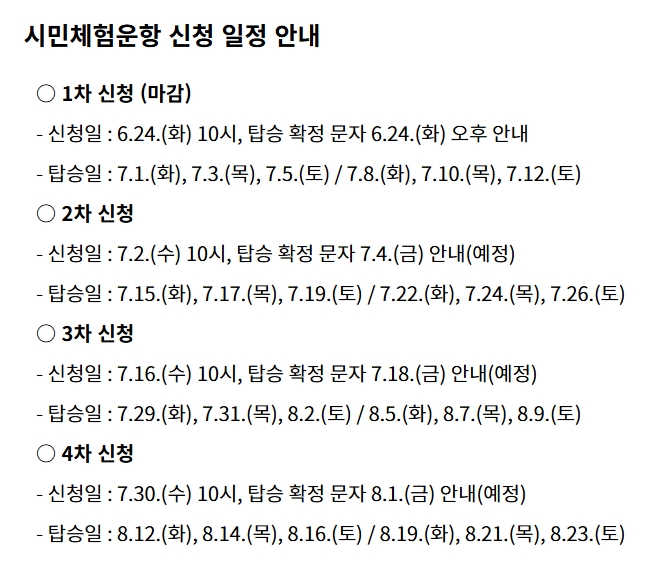 - 각 차수별로 신청일과 탑승일이 다르므로, 꼭 본인의 확정 문자를 확인하세요.